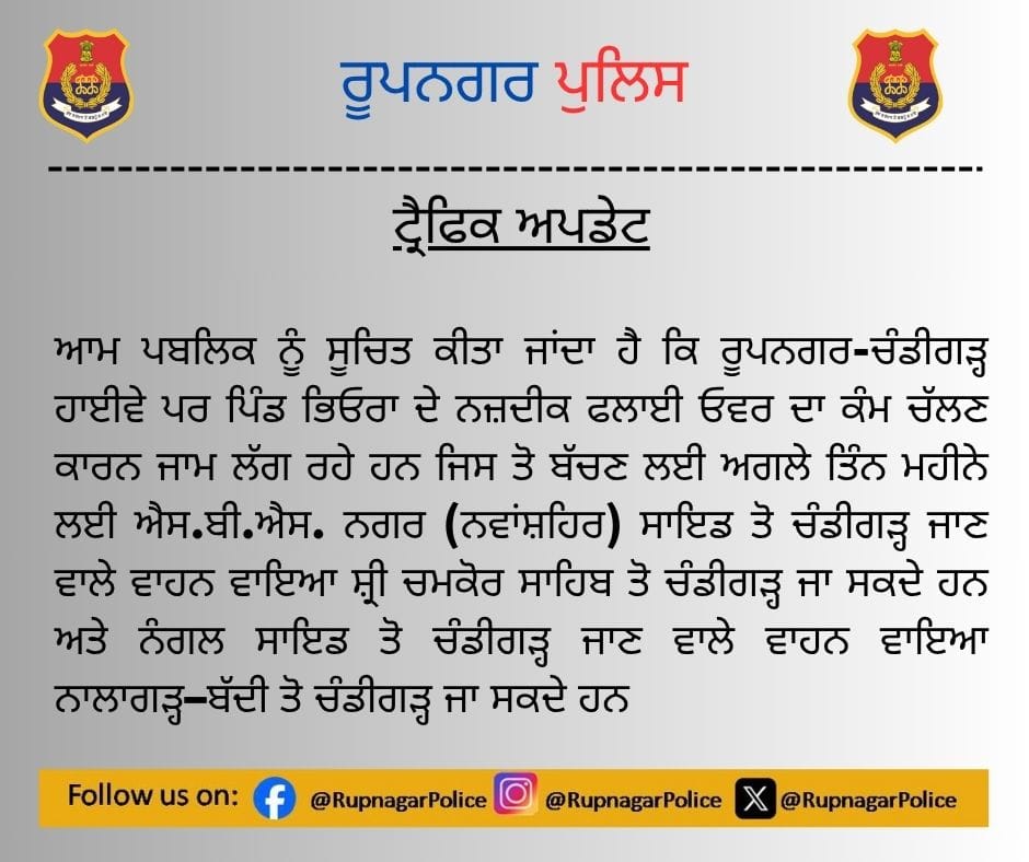 ਰੂਪਨਗਰ, 28 ਮਈ: ਸੀਨੀਅਰ ਪੁਲਿਸ ਕਪਤਾਨ ਰੂਪਨਗਰ ਸ. ਗੁਲਨੀਤ ਸਿੰਘ ਖੁਰਾਣਾ ਨੇ ਆਮ ਪਬਲਿਕ ਨੂੰ ਸੂਚਿਤ ਕਰਦਿਆਂ ਦੱਸਿਆ ਕਿ ਰੂਪਨਗਰ-ਚੰਡੀਗੜ੍ਹ ਹਾਈਵੇ ਤੇ ਪਿੰਡ ਭਿਓਰਾ ਦੇ ਨਜ਼ਦੀਕ ਫਲਾਈ ਓਵਰ ਦਾ ਕੰਮ ਚੱਲਣ ਕਾਰਨ ਜਾਮ ਲੱਗ ਰਹੇ ਹਨ ਜਿਸ ਤੋਂ ਬੱਚਣ ਲਈ ਅਗਲੇ ਤਿੰਨ ਮਹੀਨੇ ਤੱਕ ਐਸ.ਬੀ.ਐਸ. ਨਗਰ (ਨਵਾਂਸ਼ਹਿਰ) ਸਾਇਡ ਤੋਂ ਚੰਡੀਗੜ੍ਹ ਜਾਣ ਵਾਲੇ ਵਾਹਨ ਵਾਇਆ ਸ਼੍ਰੀ ਚਮਕੌਰ ਸਾਹਿਬ ਤੋਂ ਚੰਡੀਗੜ੍ਹ ਜਾ ਸਕਦੇ ਹਨ ਅਤੇ ਨੰਗਲ ਸਾਇਡ ਤੋਂ ਚੰਡੀਗੜ੍ਹ ਜਾਣ ਵਾਲੇ ਵਾਹਨ ਵਾਇਆ ਨਾਲਾਗੜ੍ਹ-ਬੱਦੀ ਤੋਂ ਚੰਡੀਗੜ੍ਹ ਜਾ ਸਕਦੇ ਹਨ।