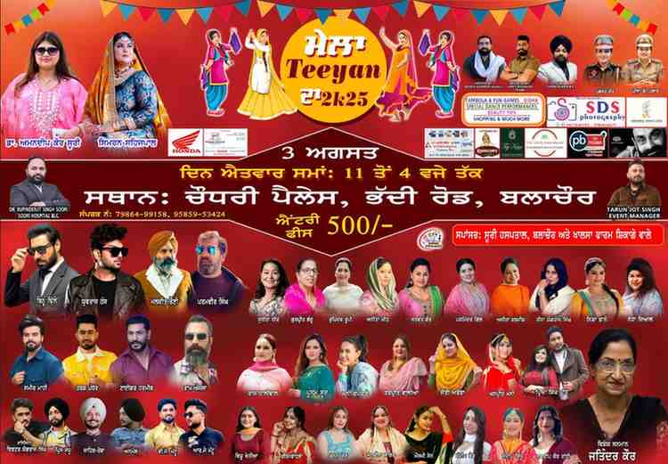 ਪੰਜਾਬ ਦਾ ਪੁਰਾਤਨ ਸੱਭਿਆਚਾਰ ਤੀਆਂ ਦਾ ਤਿਉਹਾਰ ਨੂੰ ਕਾਇਮ ਰੱਖਣ ਲਈ ਸੂਰੀ ਹਸਪਤਾਲ ਭੱਦੀ ਰੋਡ ਬਲਾਚੌਰ ਅਤੇ ਖਾਲਸਾ ਫਾਰਮ ਸ਼ਿਕਾਗੋ ਵਾਲਿਆ ਵੱਲੋਂ ਹਰ ਸਾਲ ਦੀ ਤਰ੍ਹਾਂ ਸਪਾਂਸਰ ਕੀਤਾ ਜਾ ਰਿਹਾ ਹੈ | ਇਹ ਤੀਆਂ ਦਾ ਮੇਲਾ ਡਾਕਟਰ ਅਮਨਦੀਪ ਕੌਰ ਸੂਰੀ ਅਤੇ ਸਿਮਰਨ ਕੌਰ ਸਹਿਜਪਾਲ ਖਾਲਸਾ ਫਾਰਮ ਸ਼ਿਕਾਗੋ ਵਾਲਿਆਂ ਦੀ ਅਗਵਾਈ ਵਿੱਚ 3 ਅਗਸਤ ਦਿਨ ਐਤਵਾਰ ਸਮਾਂ 11 ਤੋਂ 4 ਵਜੇ ਤੱਕ ਚੌਧਰੀ ਪੈਲੇਸ ਭੱਦੀ ਰੋਡ ਬਲਾਚੌਰ ਵਿਖੇ ਕਰਵਾਇਆ ਜਾ ਰਿਹਾ ਹੈ | ਇਸ ਸਬੰਧੀ ਪੱਤਰਕਾਰਾਂ ਨੂੰ ਜਾਣਕਾਰੀ ਦਿੰਦੇ ਹੋਏ ਡਾਕਟਰ ਅਮਨਦੀਪ ਕੌਰ ਸੂਰੀ ਅਤੇ ਸਿਮਰਨ ਸਹਿਜਪਾਲ ਨੇ ਦੱਸਿਆਂ ਕਿ ਇਸ ਮੌਕੇ ਐਂਟਰੀ ਫੀਸ 500 ਰੁਪਏ ਰੱਖੀ ਗਈ ਹੈ | ਇਸ ਤੀਆਂ ਦੇ ਮੇਲੇ ਵਿੱਚ , ਪ੍ਰਭਜੋਤ ਕੌਰ, ਮੀਨਾ ਕੇ ਪਵਾਰ ਵੀ ਵਿਸ਼ੇਸ਼ ਤੌਰ ਤੇ ਸ਼ਿਰਕਤ ਕਰਨਗੀਆਂ | ਇਸ ਮੇਲੇ ਵਿੱਚ ਪੰਜਾਬ ਦੇ ਪ੍ਰਸਿੱਧ ਗਾਇਕ ਐਕਰ, ਐਕਟਰ ਵਿਸ਼ੇਸ਼ ਤੌਰ ਤੇ ਸ਼ਿਰਕਤ ਕਰ ਰਹੇ ਹਨ | ਇਸ ਤੀਆਂ ਦੇ ਮੇਲੇ ਵਿੱਚ ਵਿਸ਼ੇਸ਼ ਸਨਮਾਨ ਜਤਿੰਦਰ ਕੌਰ ਵੱਲੋਂ ਕੀਤਾ ਜਾਵੇਗਾ | ਇਸ ਤੀਆਂ ਦੇ ਮੇਲੇ ਵਿੱਚ ਬਿੰਨੂ ਢਿੱਲੋਂ , ਯੁਵਰਾਜ ਹੰਸ, ਮਲਕੀਤ ਰੌਣੀ, ਪਰਮਵੀਰ ਸਿੰਘ, ਸਮੀਰ ਮਾਹੀ, ਹਰਸ਼ ਪੰਧੇਰ, ਟਾਈਗਰ ਹਰਮੀਕ, ਰਾਮ ਔਜਲਾ ,ਵਿਕਟਰ ਯੋਗਰਾਜ ਸਿੰਘ, ਪਿ੍ੰਸ ਸੰਧੂ, ਅਨਮੋਲ , ਵੀਜੇ ਮੱਟੂ, ਆਰਜੇ ਮੱਟੂ ਅਤੇ ਸੁਨੀਤਾ ਧੀਰ, ਗੁਰਪ੍ਰੀਤ ਭੰਗੂ, ਰੁਪਿੰਦਰ ਰੂਪੀ, ਅਨੀਤਾ ਮੀਤ, ਸਤਵੰਤ ਕੌਰ, ਪਰਮਿੰਦਰ ਗਿੱਲ,ਅਨੀਤਾ ਸ਼ਬਦੀਸ਼, ਨੀਨਾ ਯੋਗਰਾਜ ਸਿੰਘ, ਨਿਸ਼ਾ ਬਾਨੋ ,ਨੇਹਾ ਦਿਆਲ, ਰਾਜ ਧਾਲੀਵਾਲ, ਪੂਨਮ ਸੂਦ, ਮਨੀ ਬੋਪਾਰਾਏ, ਹਰਪ੍ਰੀਤ ਵਾਲੀਆ, ਜੋਤੀ ਆਰੋੜਾ, ਮਨਪ੍ਰੀਤ ਮਨੀ, ਪਿ੍ਆ ਸਿੰਘ ਪ੍ਰੀਤ, ਵਿਸ਼ੂ ਖੇੜੀਆ, ਰੀਤ ਕਾਹਲੋਂ , ਕਨਨ ਸੇਠ, ਮਰਜੀਨਾ ਸਾਗਰ, ਮੌਸਮੀ ਸੇਨ, ਸੰਦੀਪ ਕੌਰ, ਸੰਦੀਪ ਸਿੱਧੂ, ਨਵਦੀਪ ਕੌਰ ਰਾਂਧੀ ਅਤੇ ਤਰੁਨਜੋਤ ਸਿੰਘ ਈਵੇਟ ਮੈਨੇਜਰ ਅਤੇ ਦੇਸ਼ ਵਿਦੇਸ਼ ਨਾਮਵਰ ਸ਼ਖਸ਼ੀਅਤਾਂ ਵਿਸ਼ੇਸ਼ ਹਾਜਰੀ ਲਗਾਉਣ ਗਏ ਇਸ ਮੌਕੇ ਡਾ ਭੁਪਿੰਦਰਜੀਤ ਸਿੰਘ ਸੂਰੀ ਨੇ ਸਮੂਹ ਹਲਕਾ ਵਾਸੀਆਂ ਨੂੰ ਇਸ ਪ੍ਰੋਗਰਾਮ ਦੌਰਾਨ ਸ਼ਮੂਲੀਅਤ ਕਰਨ ਲਈ ਸਾਰਿਆਂ ਨੂੰ ਅਪੀਲ ਕੀਤੀ